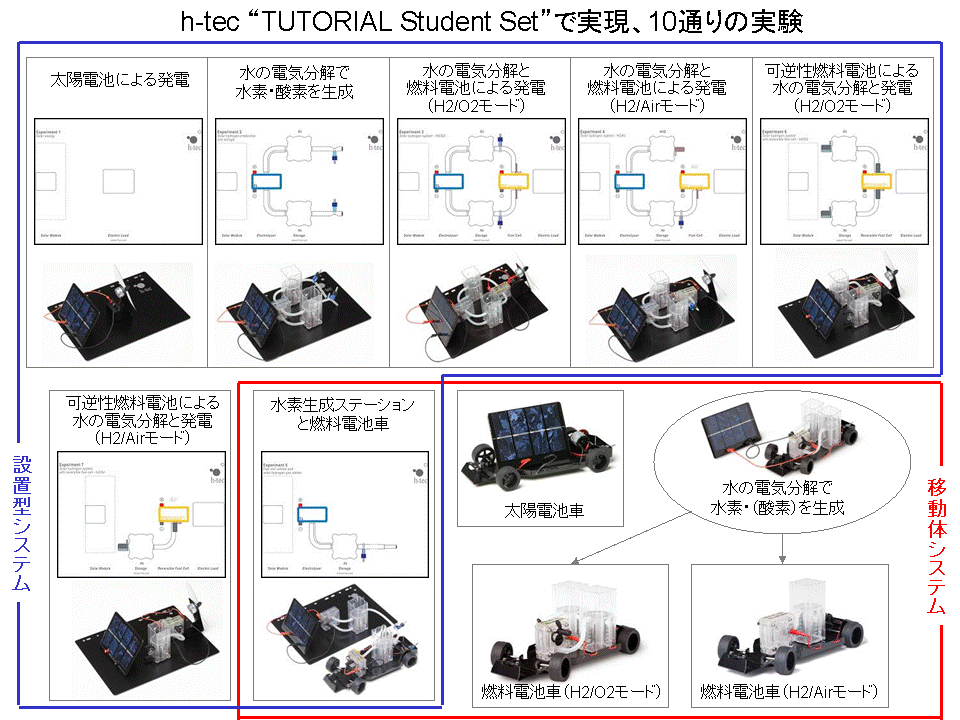 付属の7種類のテンプレート・シートに合わせて、パーツをユーザーが組み合わせることで7通りの設置型システムの実験と、太陽電池車・燃料電池車として3通りの移動体システムとしての走行を実現。