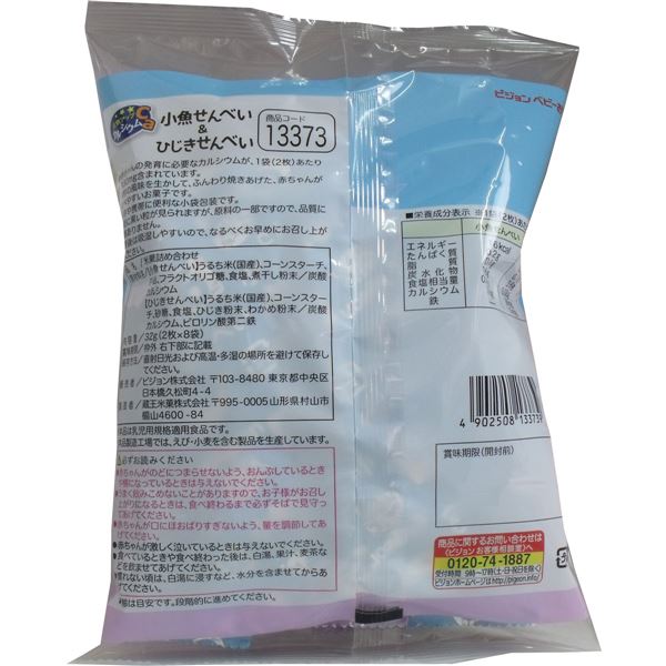 【ピジョン 元気アップCa 小魚せんべい&ひじきせんべいの原材料】小魚せんべい・・・うるち米(国産)、コーンスターチ、砂糖、フラクトオリゴ糖、食塩、煮干し粉末、炭酸カルシウムひじきせんべい・・・うるち米(国産)、コーンスターチ、砂糖、食塩、ひじき粉末、わかめ粉末、炭酸カルシウム、ピロリン酸第二鉄【栄養成分】(1袋(2枚)あたり)<小魚せんべい>エネルギー・・・16kcaLたんぱく質・・・0.2g脂質・・・0.1g炭水化物・・・3.6g食塩相当量・・・0.06gカルシウム・・・31mg<ひじきせんべい>エネルギー・・・16kcaLたんぱく質・・・0.3g脂質・・・0.1g炭水化物・・・3.6g食塩相当量・・・0.08gカルシウム・・・36mg鉄・・・1.0mg【注意事項】・赤ちゃんがのどにつまらせないよう、おんぶしているときや横になっているときは与えないでください。