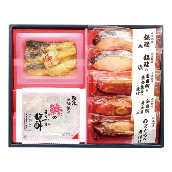 ▼商品名ダイマツ山陰大松 父の日限定包装 氷温熟成 お魚総菜ギフトセット7切▼セット内容金目鯛と黄金生姜の煮付100g×2・のどぐろの煮付け50g×1・銀鮭の塩焼き70g×2・鯵のまろやか甘酢150g×2▼箱サイズ33×42×4.5cm▼メーカー/ブランドダイマツ▼品番STOS-40※内容・デザインなど変更になる場合があります。